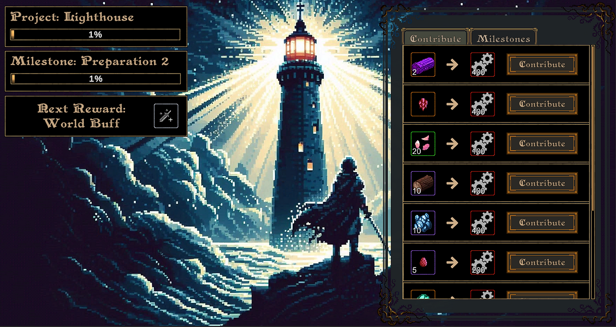 In order construct the lighthouse, players will need to come together and provide resources in exchange for progress. There are 30 total milestones to complete the project, and each milestone requires a different amount of progress to complete and unlocks a different bonus for participants.